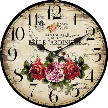 Ρολόι τοίχου στρογγυλό από MDF σε γηίνες αποχρώσεις με σχέδιο κόκκινα και μοβ τριαντάφυλλα.