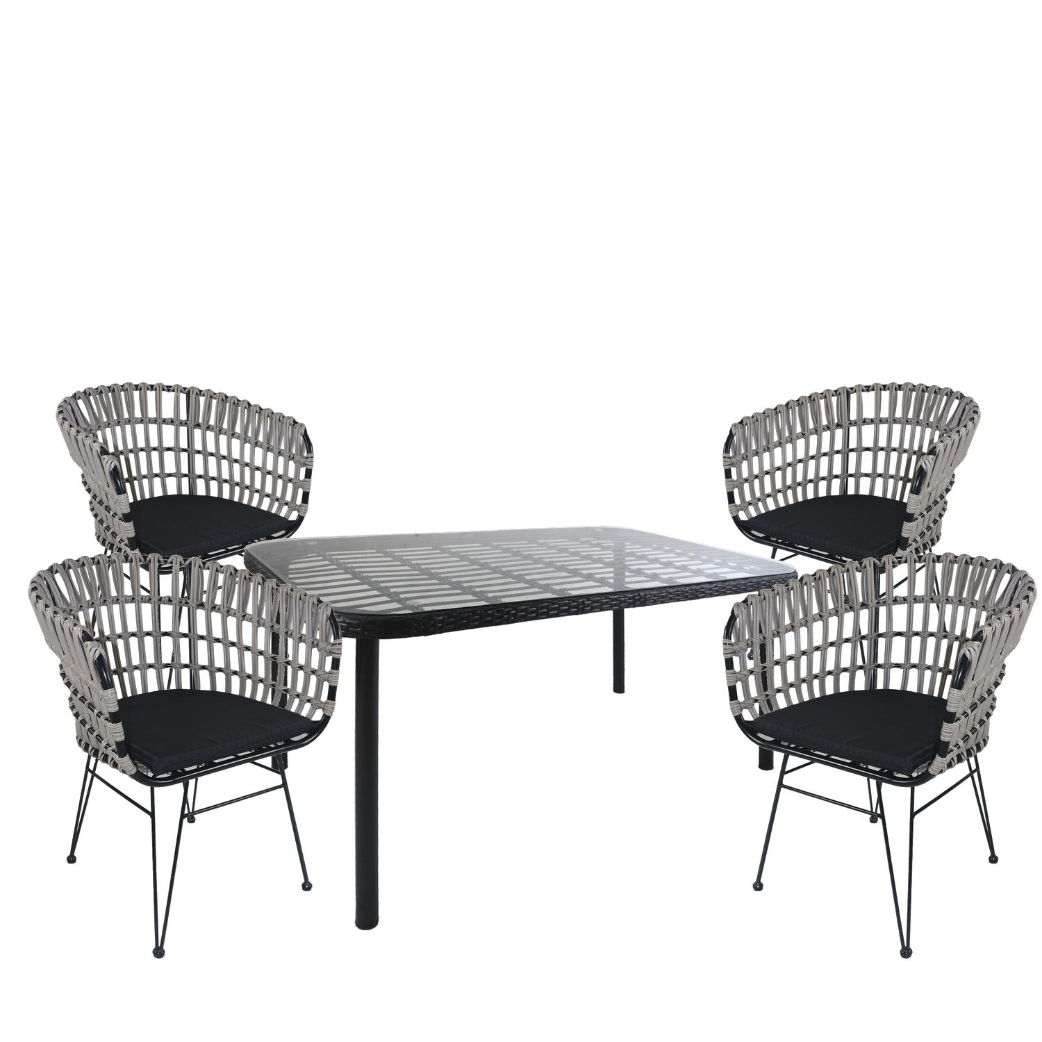 Σετ τραπεζαρία κήπου AMPLAS μαύρο μέταλλο/rattan/γυαλί με 4 καρέκλες.