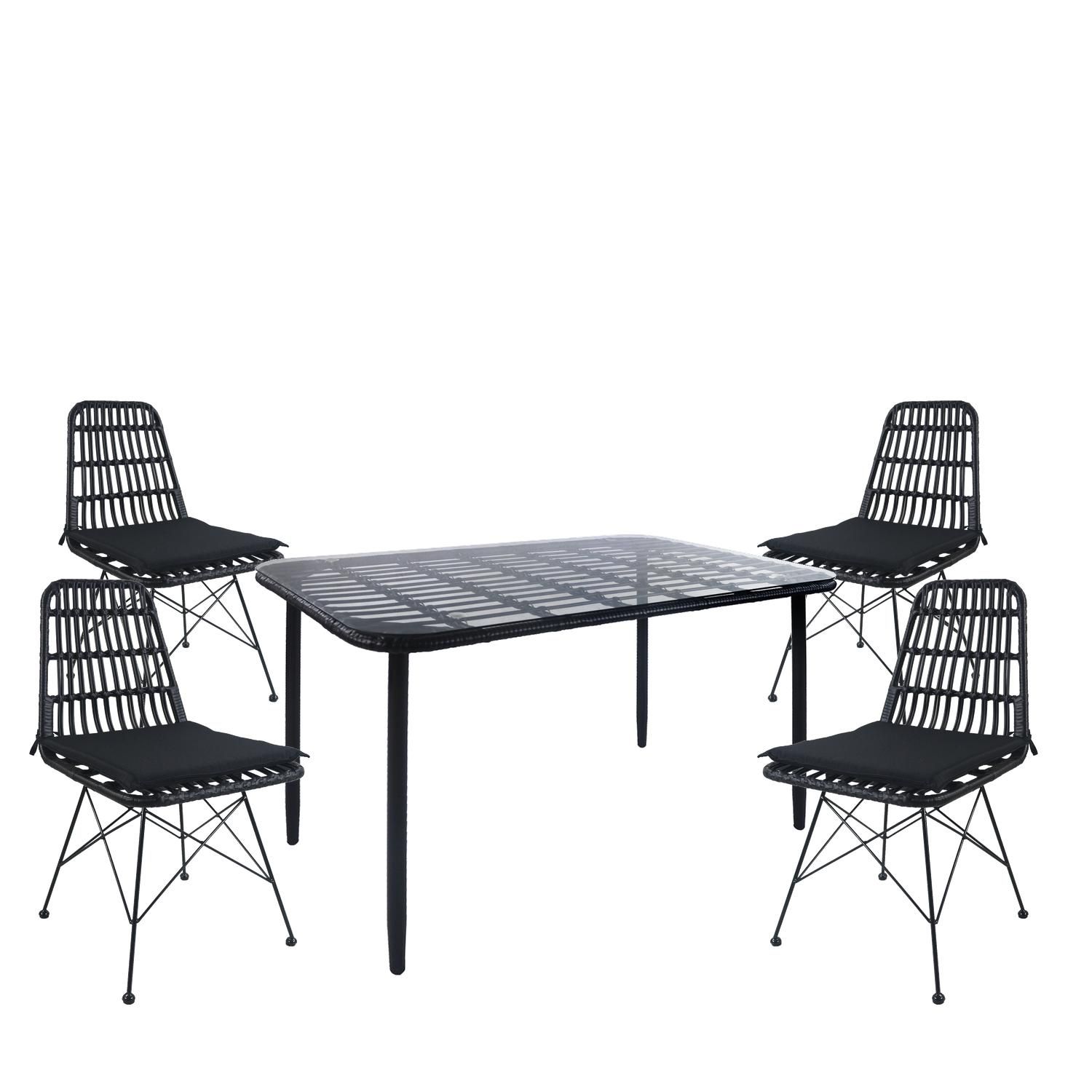 Σετ τραπεζαρία κήπου ANNIUS μαύρο μέταλλο/rattan/γυαλί με 4 καρέκλες.