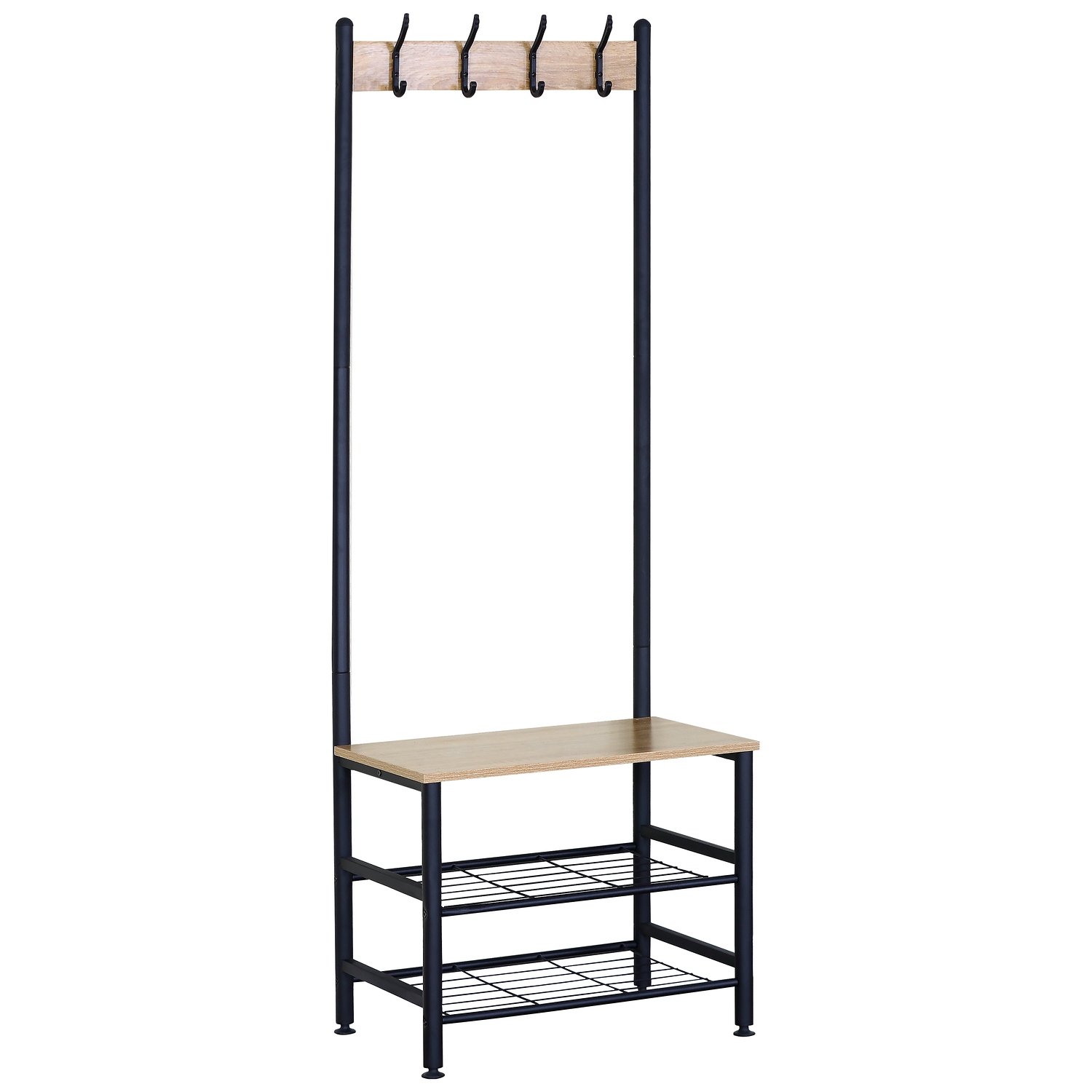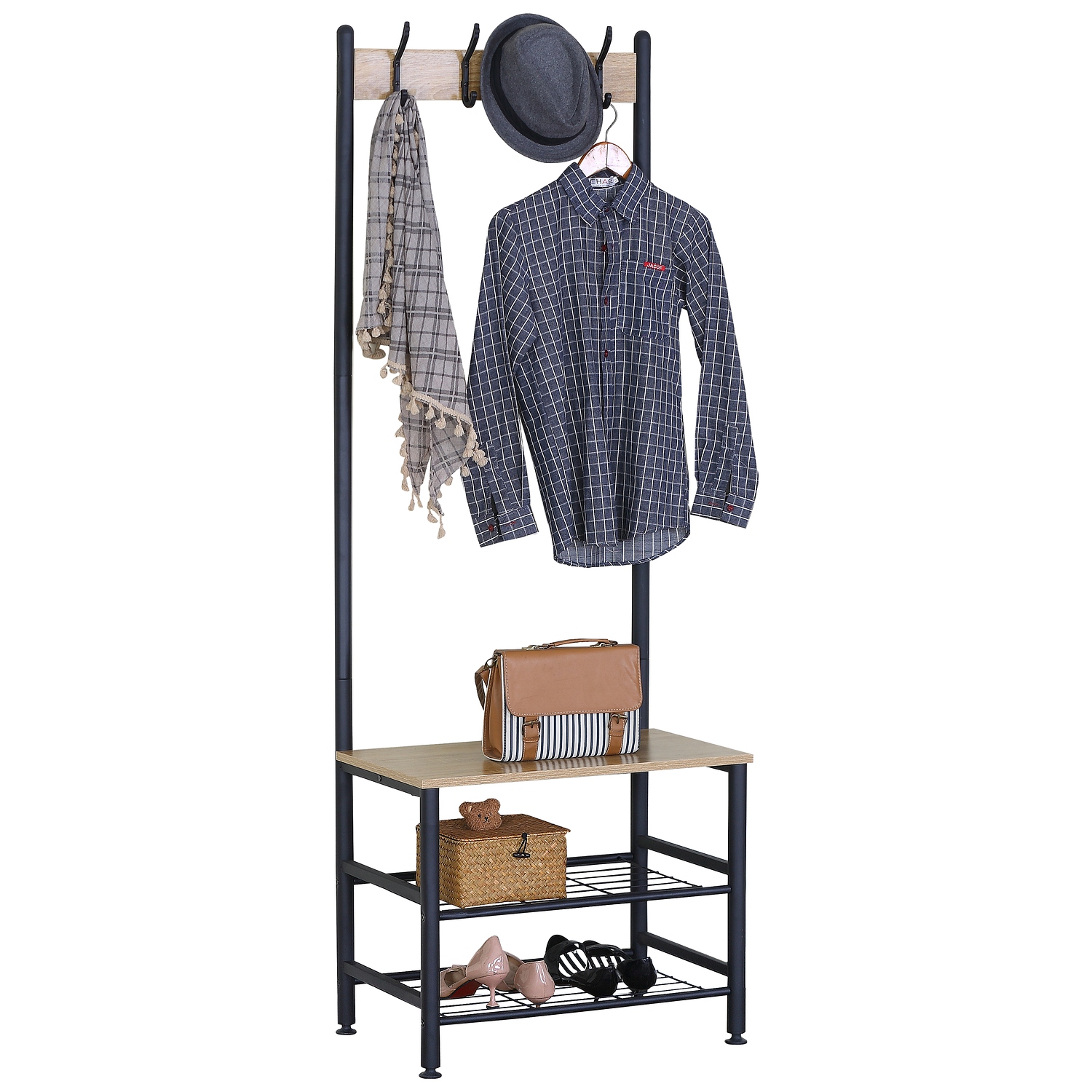 Κατασκευασμένο από μοριοσανίδα υψηλής ποιότητας με φινίρισμα δρυός και ανθεκτικό μαύρο μέταλλο, το έπιπλο εξασφαλίζει σταθερότητα και μακροχρόνια χρήση. Οι γάντζοι και τα ράφια είναι σχεδιασμένα για βέλτιστη λειτουργικότητα.