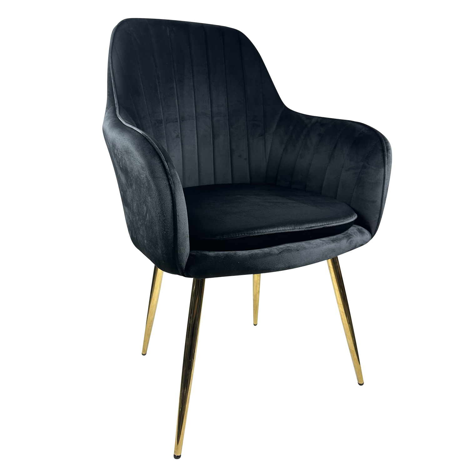 Καρέκλα τραπεζαρίας MYRTLE σε κλασικό σχεδιασμό με επένδυση από βελούδο και μεταλλικά στιβαρά πόδια σε χρυσό χρώμα. Το κάθισμο είνα ευρύχωρο και βολικό, με καπιτονέ πλάτη και μεγάλα μπράτσα, κατασκευασμένο από ανθεκτικό ξύλινο σκελετό με βελούδινη επένδυση και γέμιση από υψηλής ποιότητας αφρώδη υλικά. Καρέκλα κλασική και συνάμα λιτή που θα αποτελέσει ανασπόσπαστο κομμάτι ενός σετ τραπεζαρίας ή και σαλονιού και θα αναδείξει τον οποιοδήποτε χώρο σας.