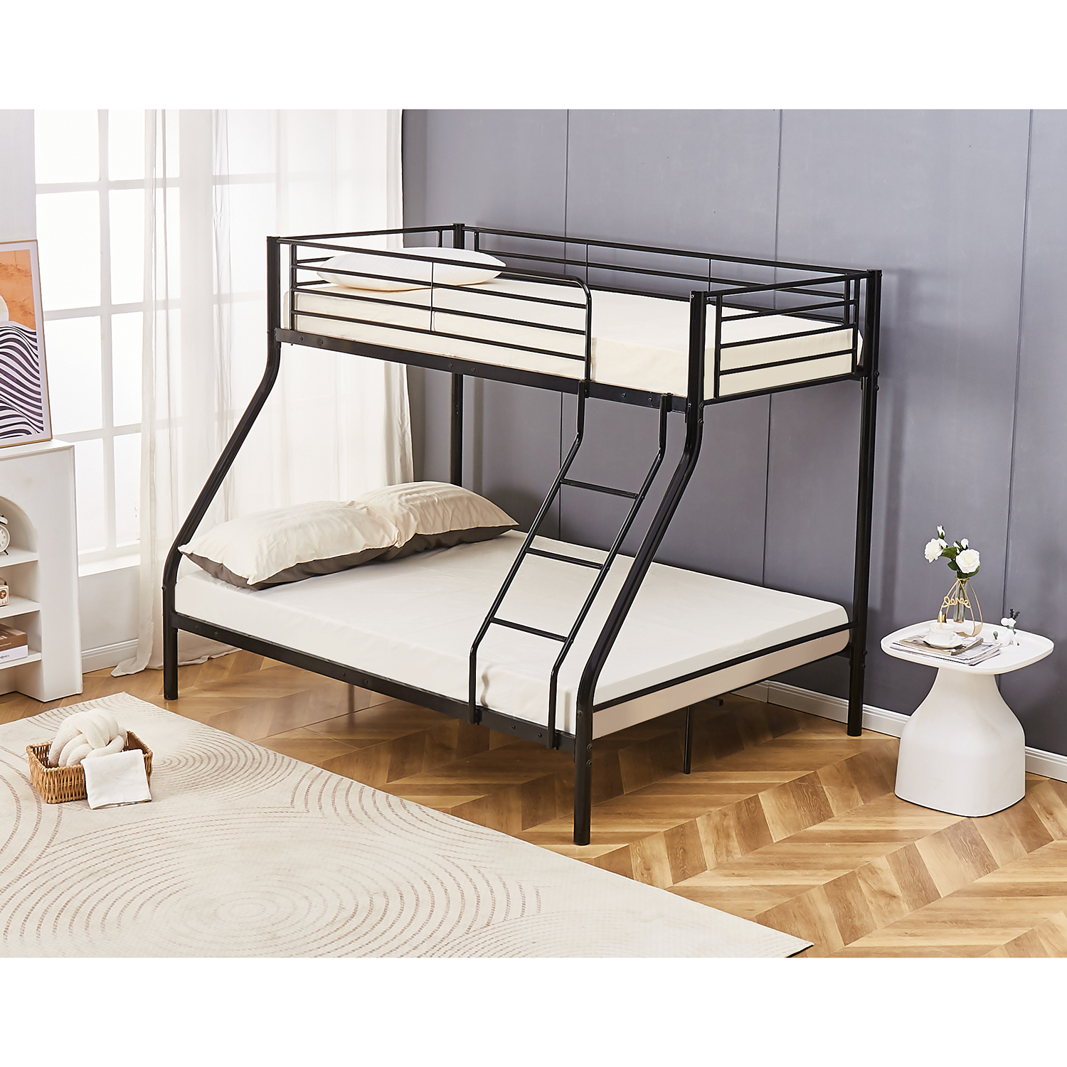 Κατασκευασμένη από ανθεκτικό μαύρο μέταλλο, η κουκέτα προσφέρει μακροχρόνια χρήση και στιβαρότητα. Το φινίρισμα είναι ανθεκτικό στις γρατζουνιές και στις καθημερινές φθορές, διατηρώντας την κουκέτα σε άριστη κατάσταση.