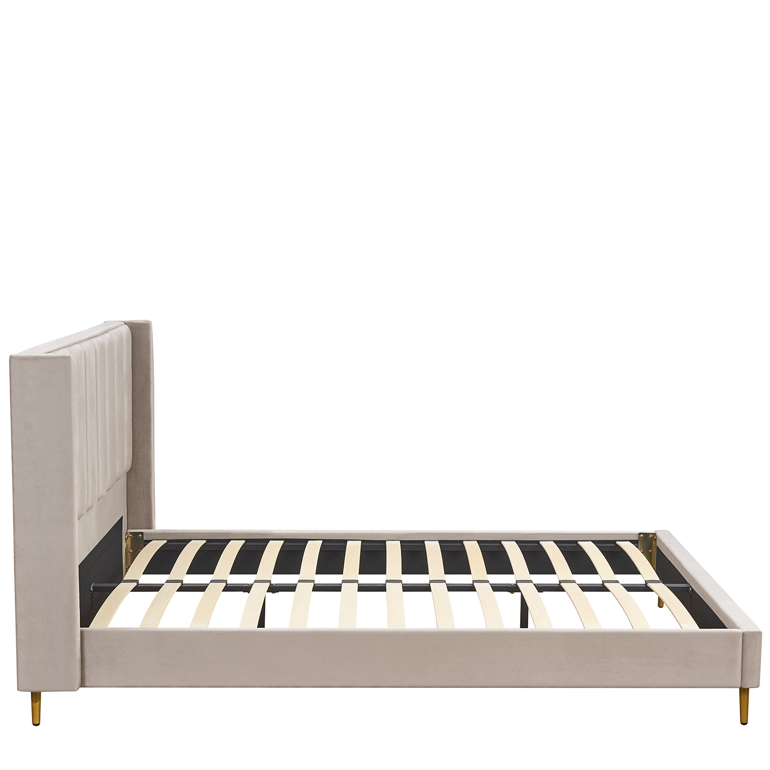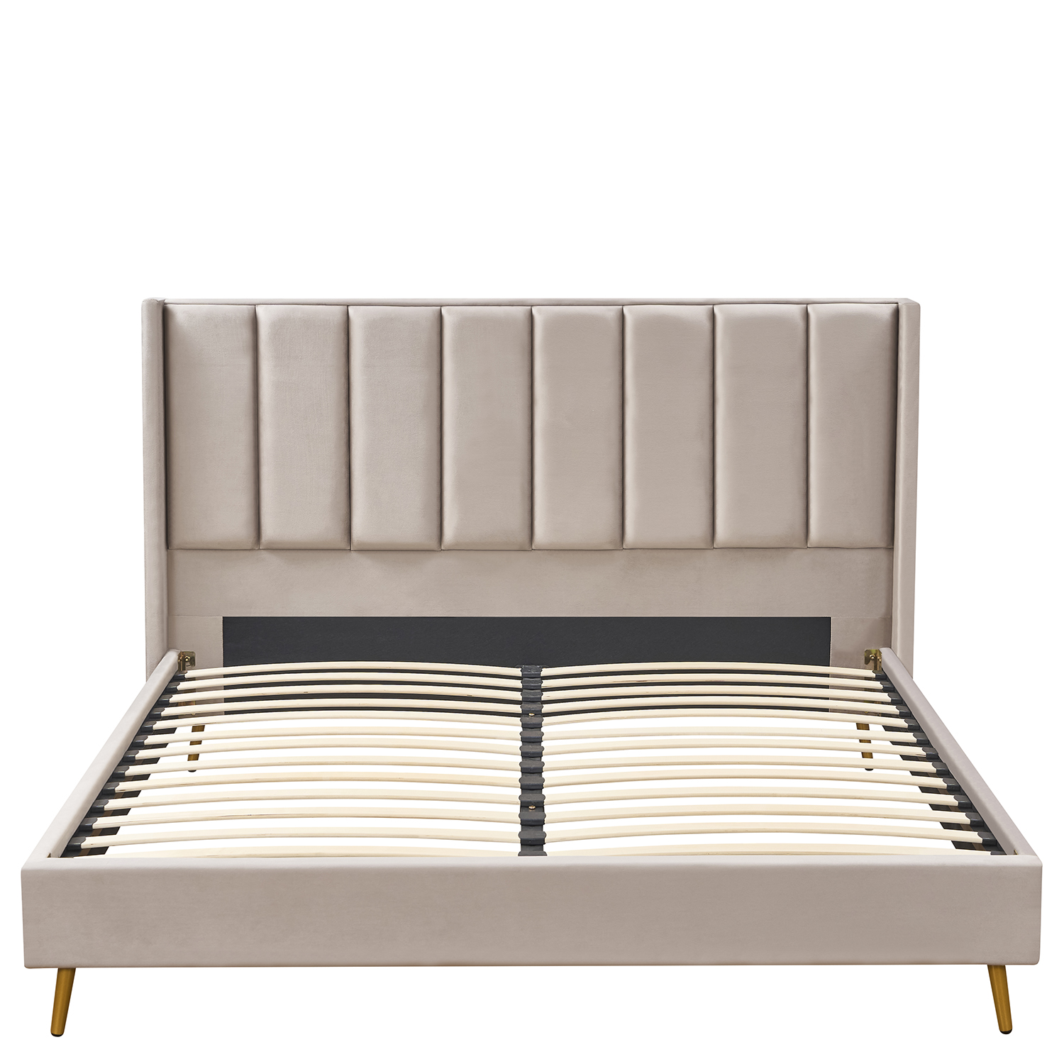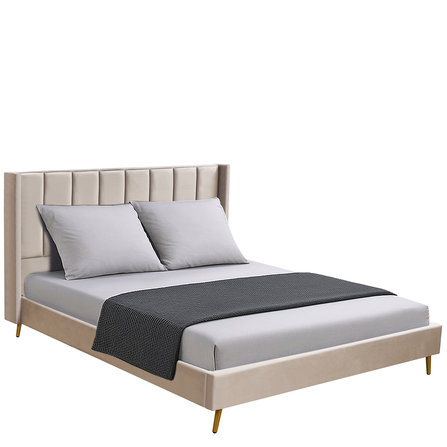 Το κρεβάτι είναι επενδυμένο με υψηλής ποιότητας μπεζ ύφασμα, προσφέροντας ανθεκτικότητα και μοντέρνα εμφάνιση. Τα χρυσά μεταλλικά πόδια προσφέρουν επιπλέον στήριξη και σταθερότητα.