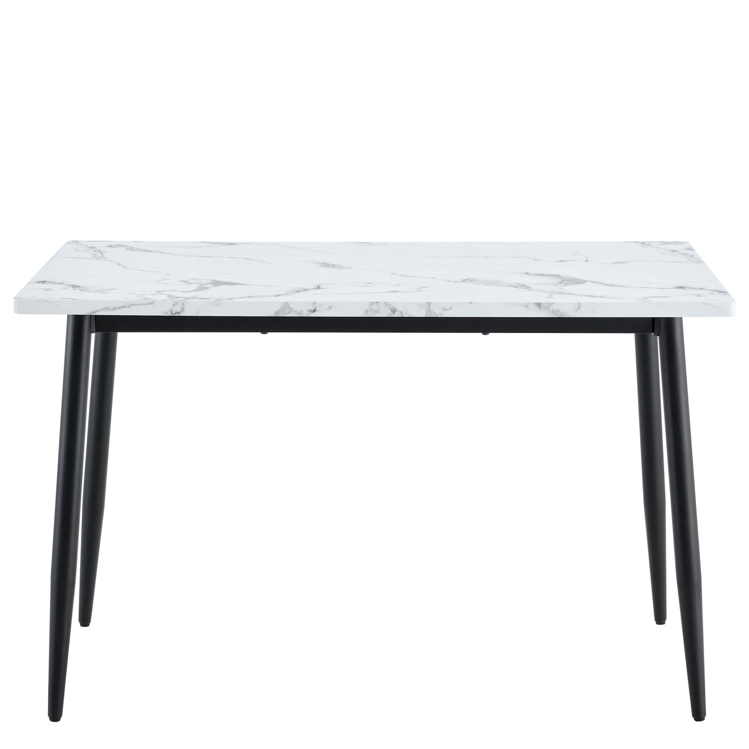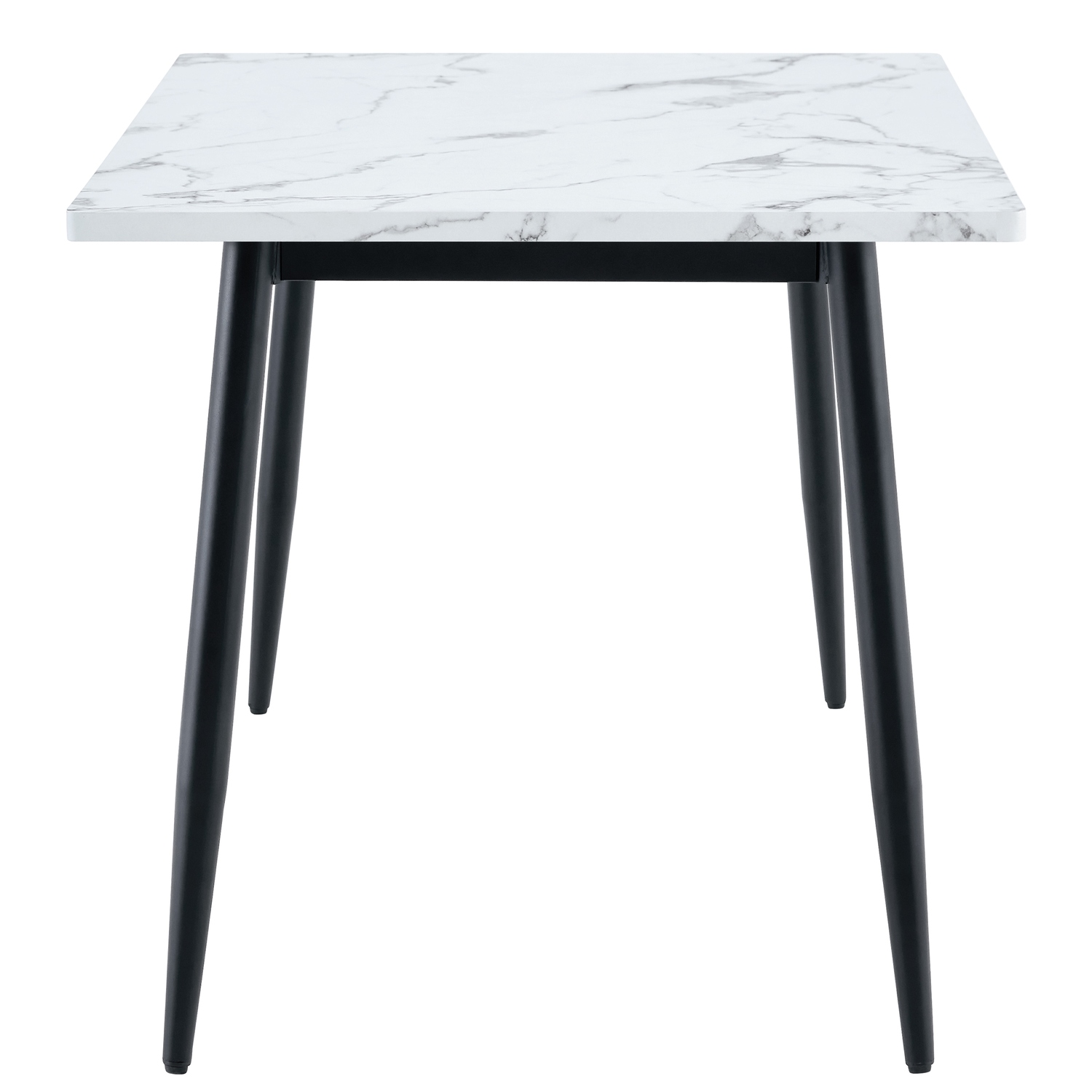 Κατασκευασμένο από μοριοσανίδα υψηλής ποιότητας με λευκό μαρμάρινο φινίρισμα και ανθεκτικό μαύρο μέταλλο, το τραπέζι εξασφαλίζει σταθερότητα και αντοχή στη χρήση. Τα υλικά του είναι ανθεκτικά στις καθημερινές φθορές.