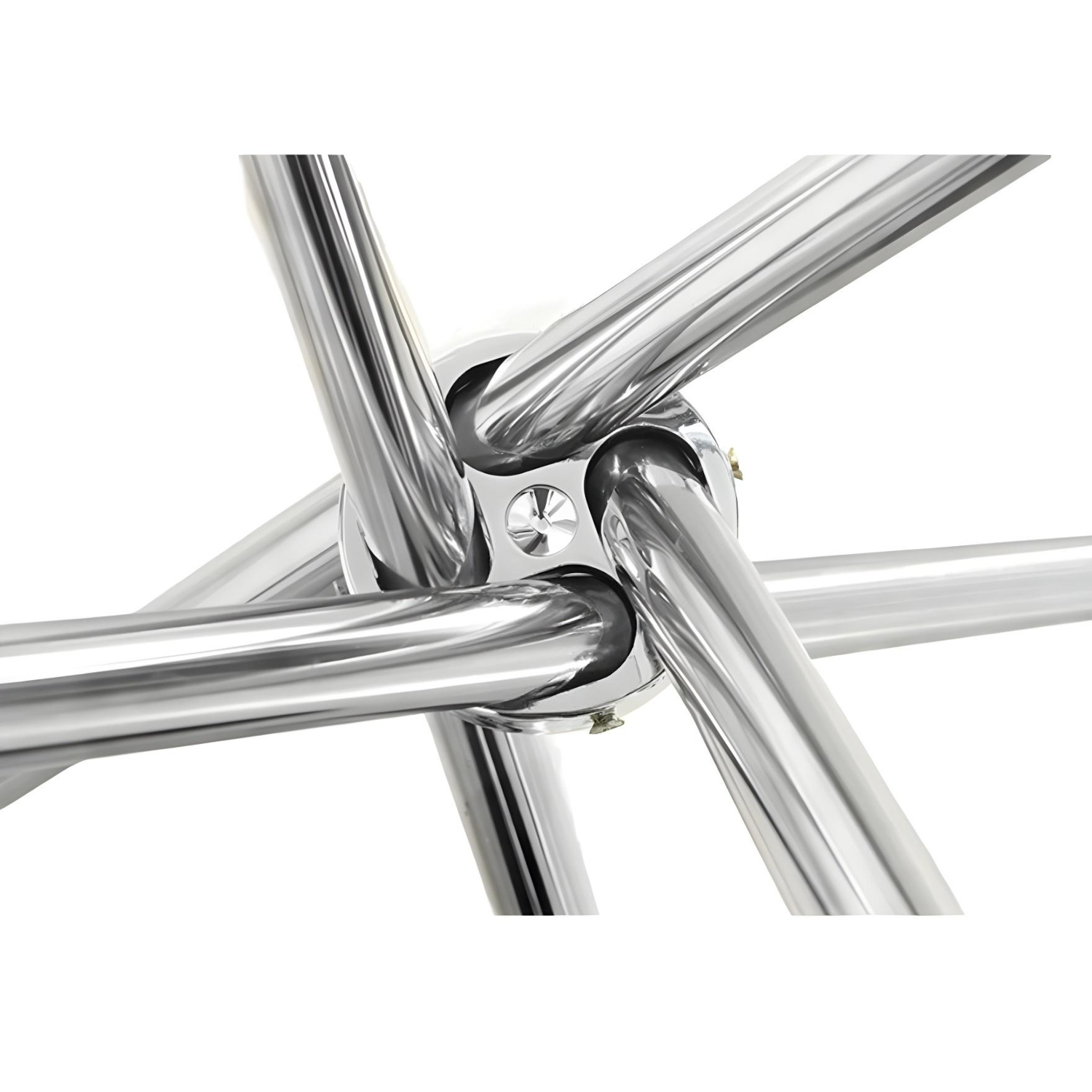 Η επιφάνεια είναι κατασκευασμένη από υψηλής ποιότητας διάφανο γυαλί, το οποίο είναι ανθεκτικό στη φθορά και εύκολο στον καθαρισμό. Η βάση από ανθεκτικό μέταλλο με φινίρισμα σε χρώμιο προσφέρει στιβαρότητα και αντοχή, ενώ το γεωμετρικό σχήμα με τους διασταυρούμενους σωλήνες χαρίζει σταθερότητα αλλά και σύγχρονη αισθητική. Η σύνδεση των ποδιών στο κεντρικό σημείο δημιουργεί μια αρμονική κατασκευή που τραβά το βλέμμα και εντυπωσιάζει με την τεχνική της αρτιότητα.