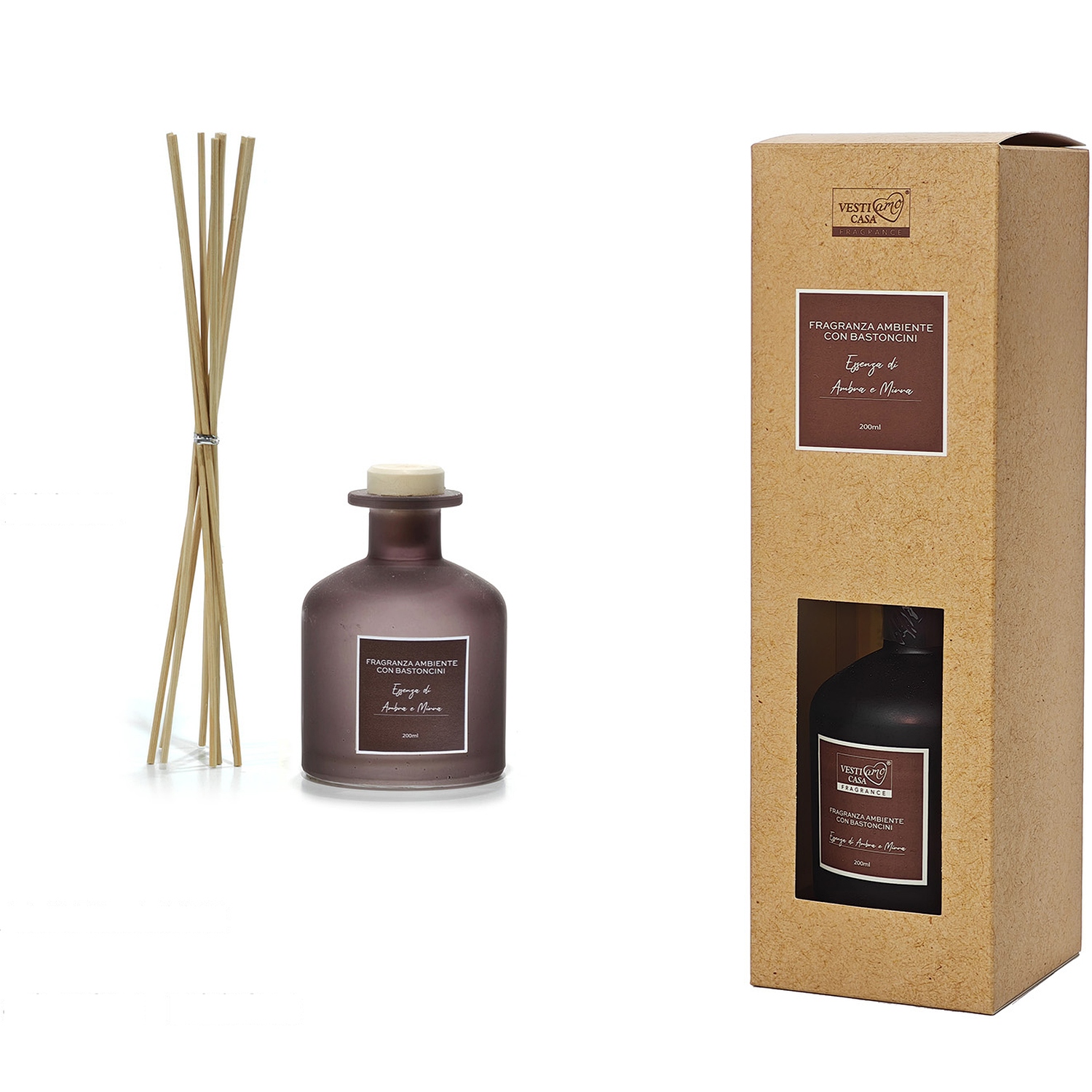 Αρωματικό χώρου με γυάλινη φιάλη και ράβδους διάχυσης αρώματος, με άρωμα κεχριμπάρι και μύρο. Ιδανικό για την αρωματοποίηση του χώρου σας.