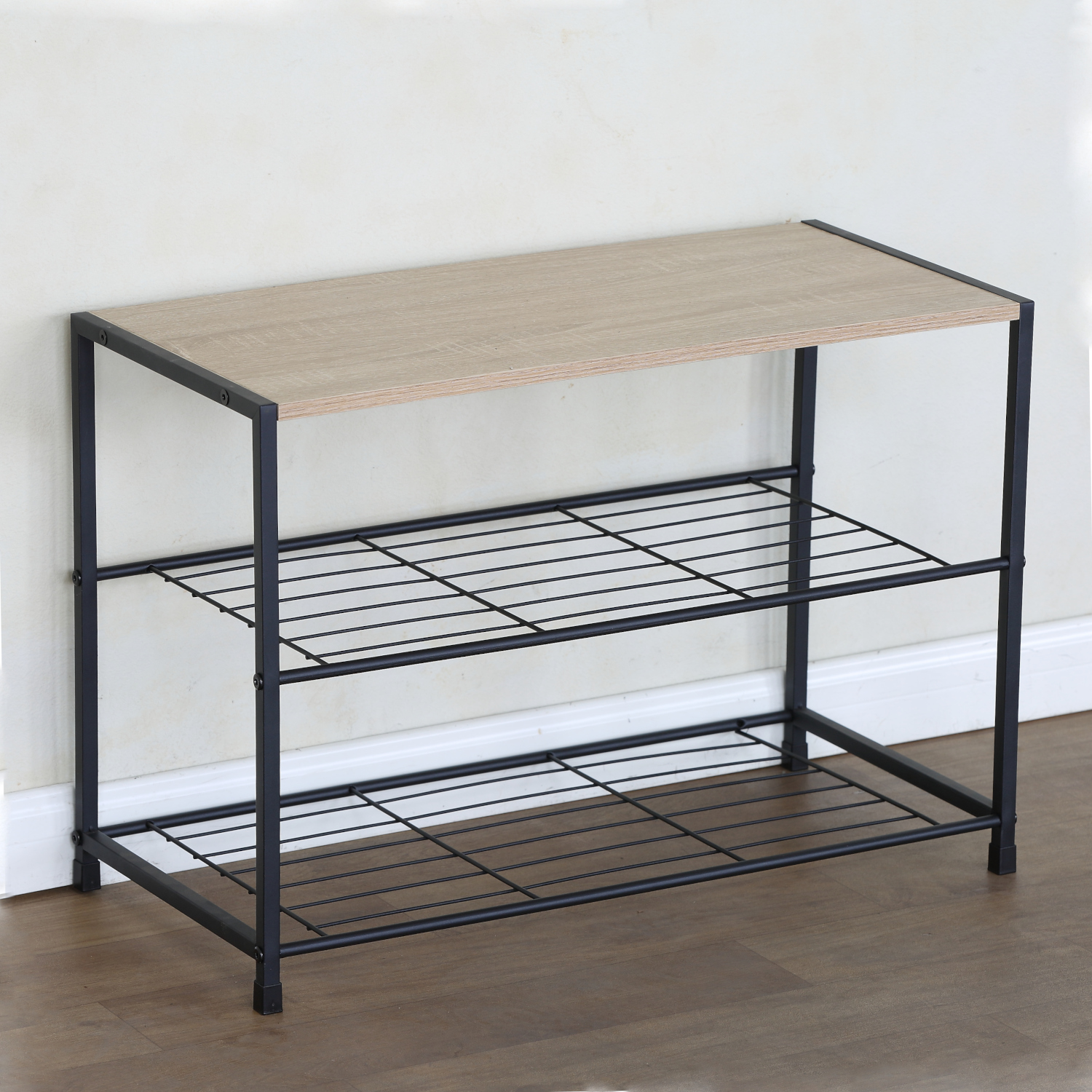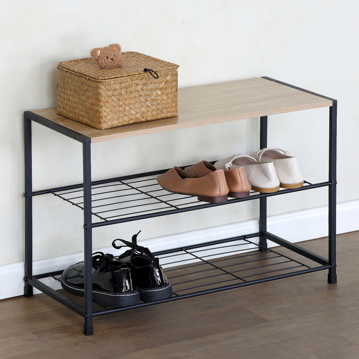 Κατασκευασμένη από μοριοσανίδα υψηλής ποιότητας με φινίρισμα δρυός και ανθεκτικό μαύρο μέταλλο, η παπουτσοθήκη εξασφαλίζει σταθερότητα και μακροχρόνια χρήση. Τα υλικά της προσφέρουν αντοχή στην καθημερινή φθορά.