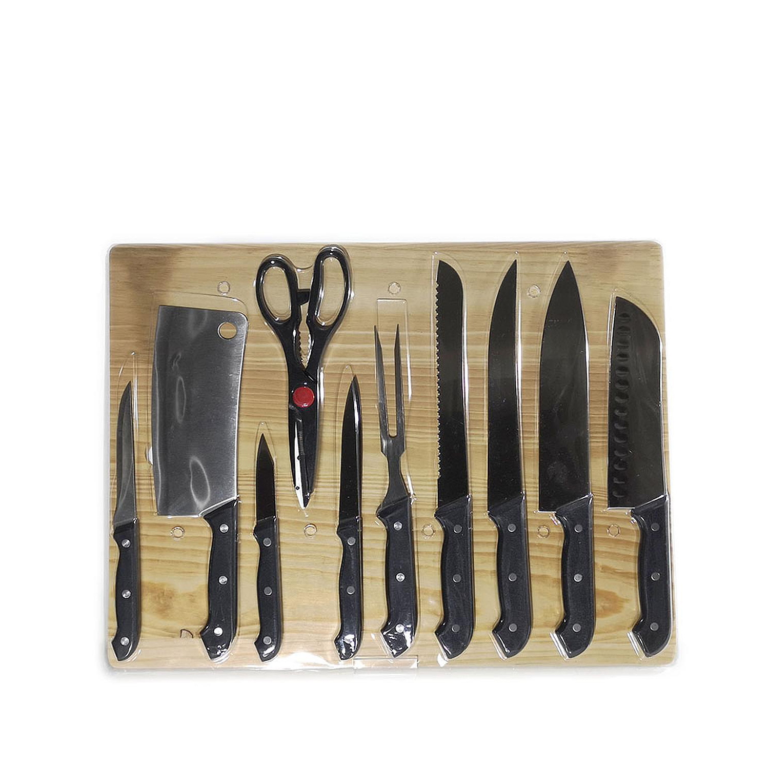 Μαχαίρια με ξύλινη βάση κοπής και ψαλίδι/ανοιχτήρι σετ 11τμχ.