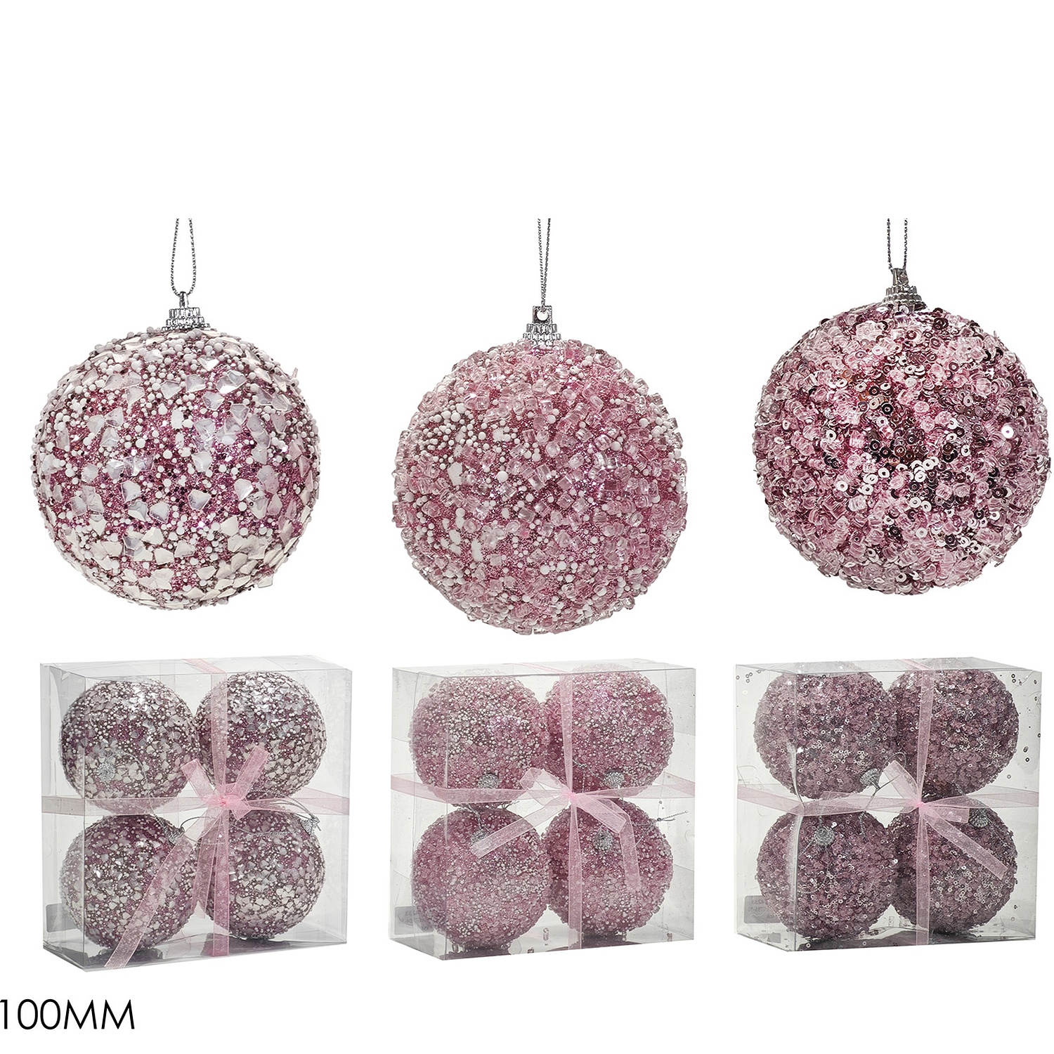 Χριστουγεννιάτικη Μπάλα Ροζ 100mm Σετ 4Τμχ Σε 3 Σχέδια
