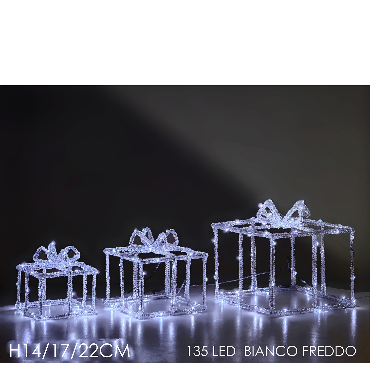 Προσθέστε μια κομψή πινελιά στη χριστουγεννιάτικη διακόσμησή σας με αυτό το σετ από 3 φωτιζόμενα δώρα. Με 135 LED λευκού ψυχρού φωτισμού, αυτά τα δώρα είναι ιδανικά για να δημιουργήσουν μια λαμπερή και εορταστική ατμόσφαιρα. Τοποθετήστε τα σε οποιοδήποτε σημείο του σπιτιού ή του κήπου σας για να ενισχύσετε τη μαγεία των γιορτών.
