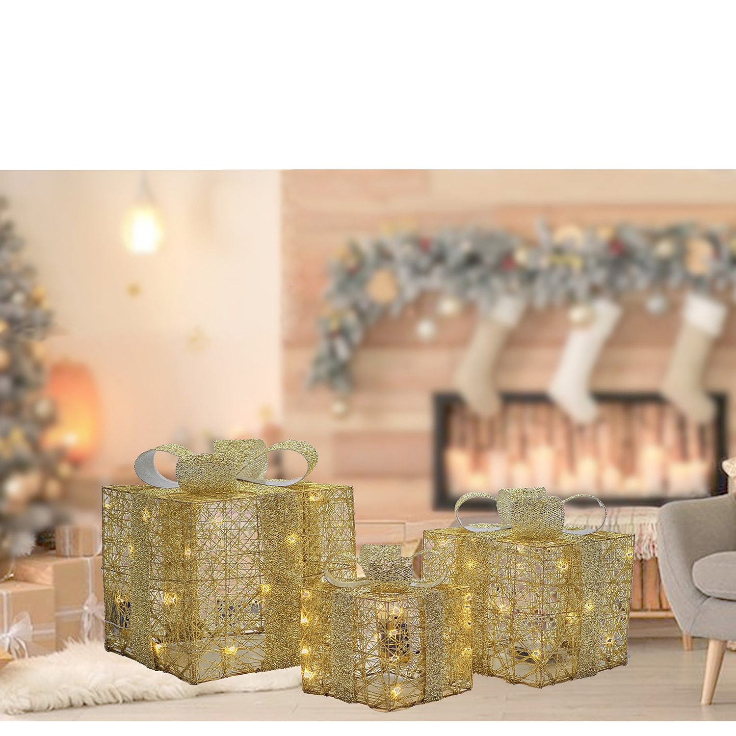 Προσθέστε μια λαμπερή και γιορτινή αίσθηση στη χριστουγεννιάτικη διακόσμησή σας με αυτό το σετ τριών πακέτων. Κάθε πακέτο είναι διακοσμημένο με MicroLED σε χρυσό, προσφέροντας λάμψη και ζωντάνια. Με διαστάσεις 17cm, 24cm και 29cm, αυτά τα πακέτα είναι ιδανικά για να τοποθετηθούν κάτω από το χριστουγεννιάτικο δέντρο ή σε οποιοδήποτε σημείο του σπιτιού σας που χρειάζεται μια γιορτινή πινελιά.