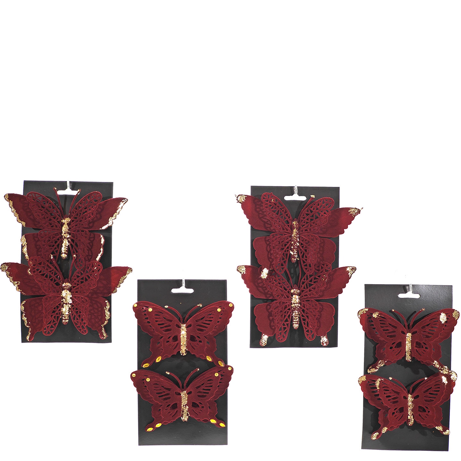 Δημιουργήστε μια μαγευτική και εορταστική ατμόσφαιρα με αυτές τις χριστουγεννιάτικες πεταλούδες σε κόκκινο χρώμα. είναι διαθέσιμο σε 2 πεταλούδες, καθεμία με μοναδικό σχέδιο, που θα προσφέρουν επιπλέον λάμψη και στυλ στο χριστουγεννιάτικο δέντρο ή σε οποιαδήποτε άλλη διακόσμηση. Αυτές οι πεταλούδες είναι ιδανικές για να προσθέσετε μια λεπτή και κομψή πινελιά στον χώρο σας.