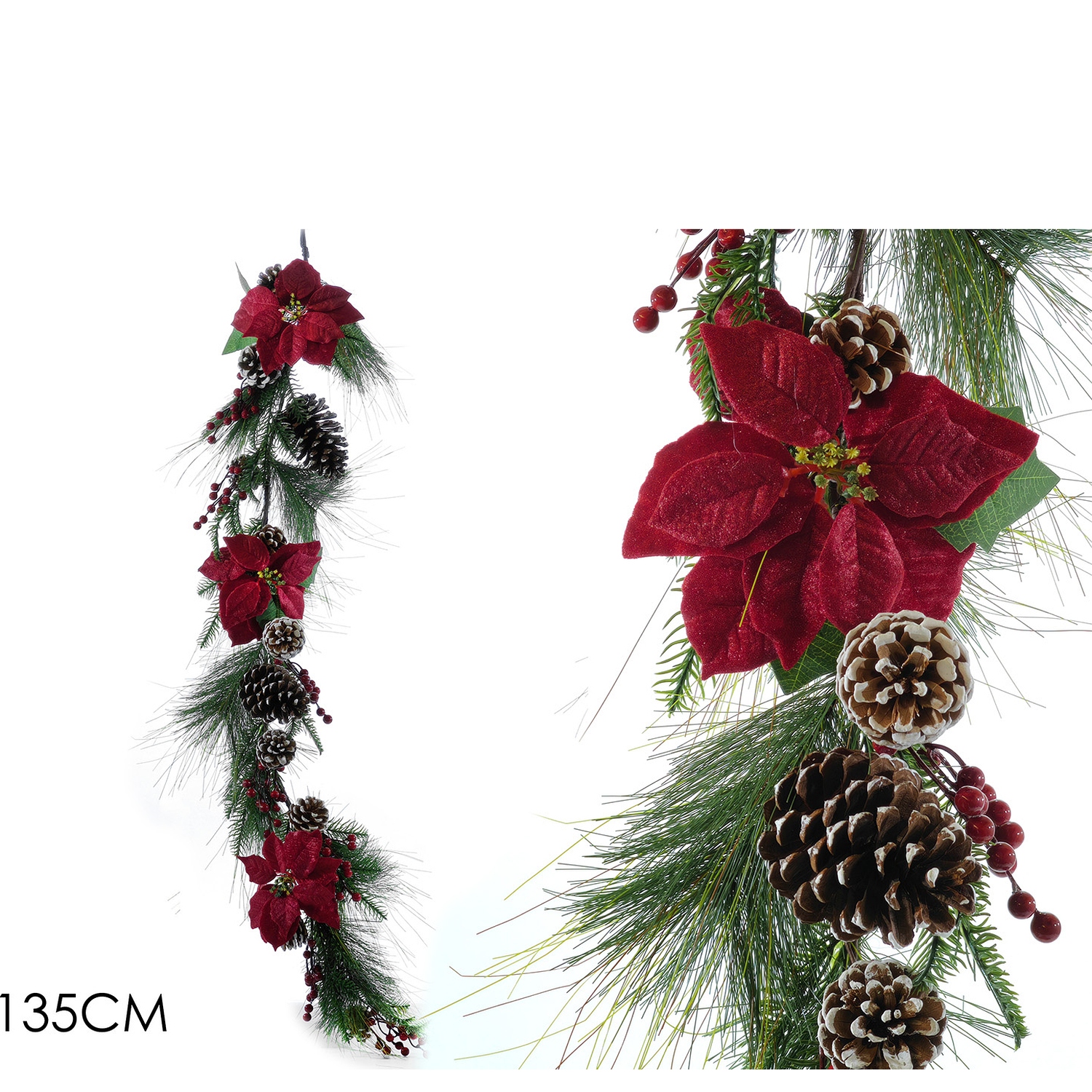 Προσθέστε μια κομψή και γιορτινή πινελιά στη διακόσμησή σας με αυτή τη χριστουγεννιάτικη γιρλάντα. Με μήκος 135cm και διακοσμημένη με αλεξανδρινό, κουκουνάρια και κόκκινα berries, αυτή η γιρλάντα είναι ιδανική για να στολίσετε πόρτες, τζάκια ή τοίχους. Προσφέρει μια ζεστή και γιορτινή αίσθηση στον χώρο σας.