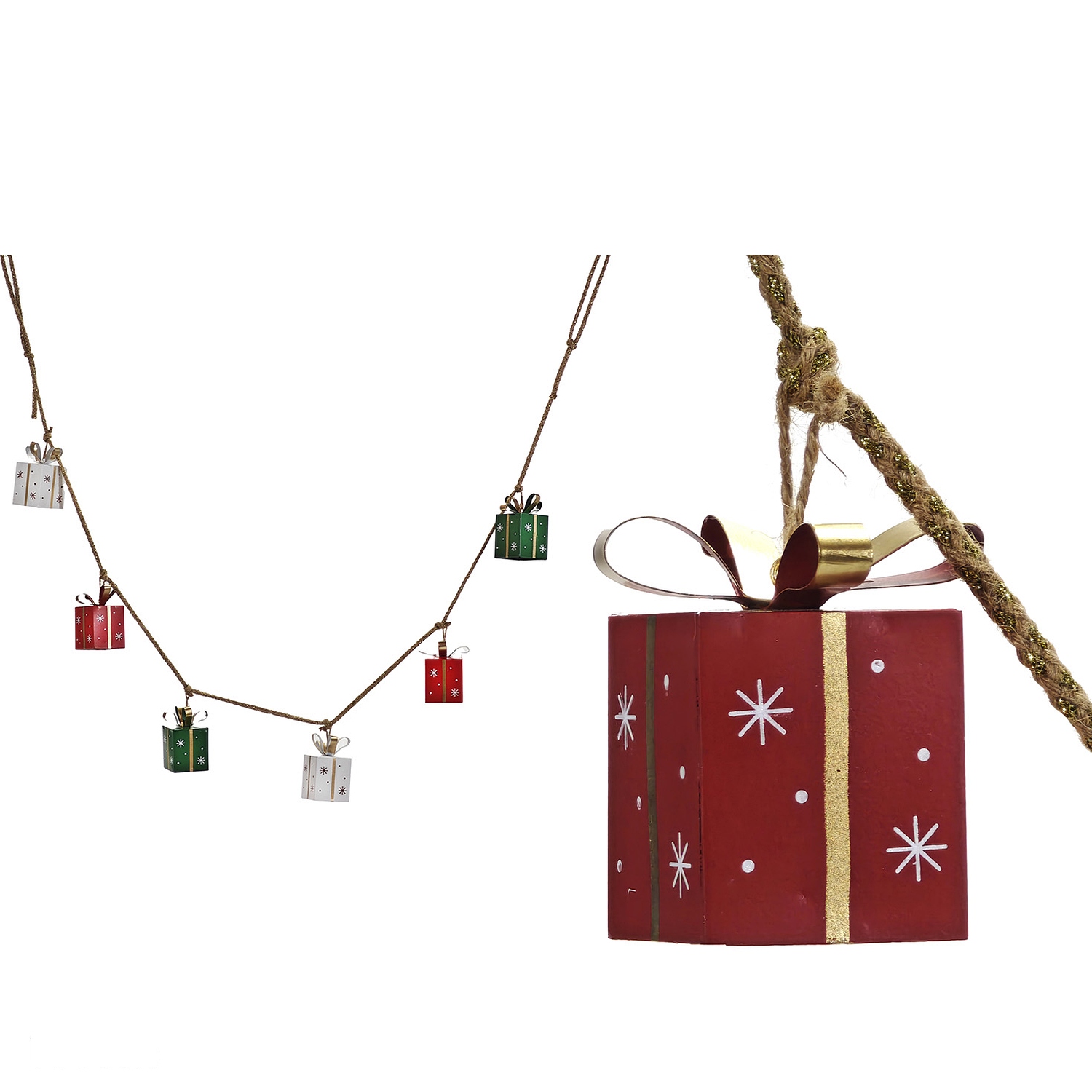 Προσθέστε μια παιχνιδιάρικη και γιορτινή πινελιά στη διακόσμησή σας με αυτή τη χριστουγεννιάτικη γιρλάντα. Με μήκος 160cm και διακοσμημένη με μικρά δώρα, αυτή η γιρλάντα είναι ιδανική για να στολίσετε πόρτες, τζάκια ή τοίχους. Προσφέρει μια ζεστή και γιορτινή αίσθηση στον χώρο σας.