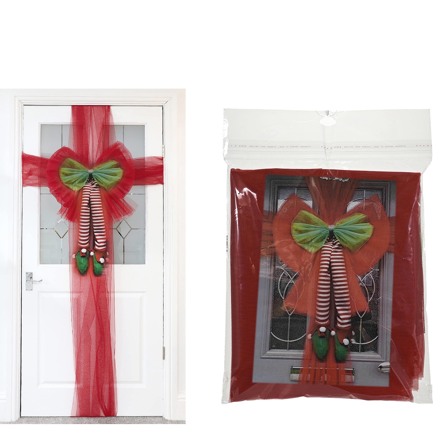 Δώστε μια διασκεδαστική και γιορτινή πινελιά στην είσοδο του σπιτιού σας με αυτόν τον χριστουγεννιάτικο φιόγκο πόρτας. Διαθέτει σχέδιο με πόδια ξωτικού που προσθέτει μια παιχνιδιάρικη αίσθηση στη διακόσμησή σας. Ιδανικός για να καλωσορίσει τους καλεσμένους σας με ένα χαμόγελο και να δημιουργήσει μια ζεστή ατμόσφαιρα.