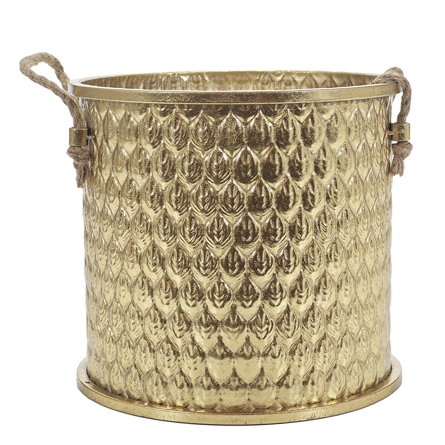 Προσθέστε μια κομψή και πολυτελή αίσθηση στο χώρο σας με αυτή τη χρυσή κασπώ. Με διάμετρο 28.5cm και ύψος 26cm, η κασπώ διαθέτει χειρολαβές από σχοινί, προσφέροντας πρακτικότητα και στυλ. Ιδανική για να φιλοξενήσει φυτά ή να χρησιμοποιηθεί ως διακοσμητικό στοιχείο, προσθέτοντας λάμψη και κομψότητα στη διακόσμησή σας.