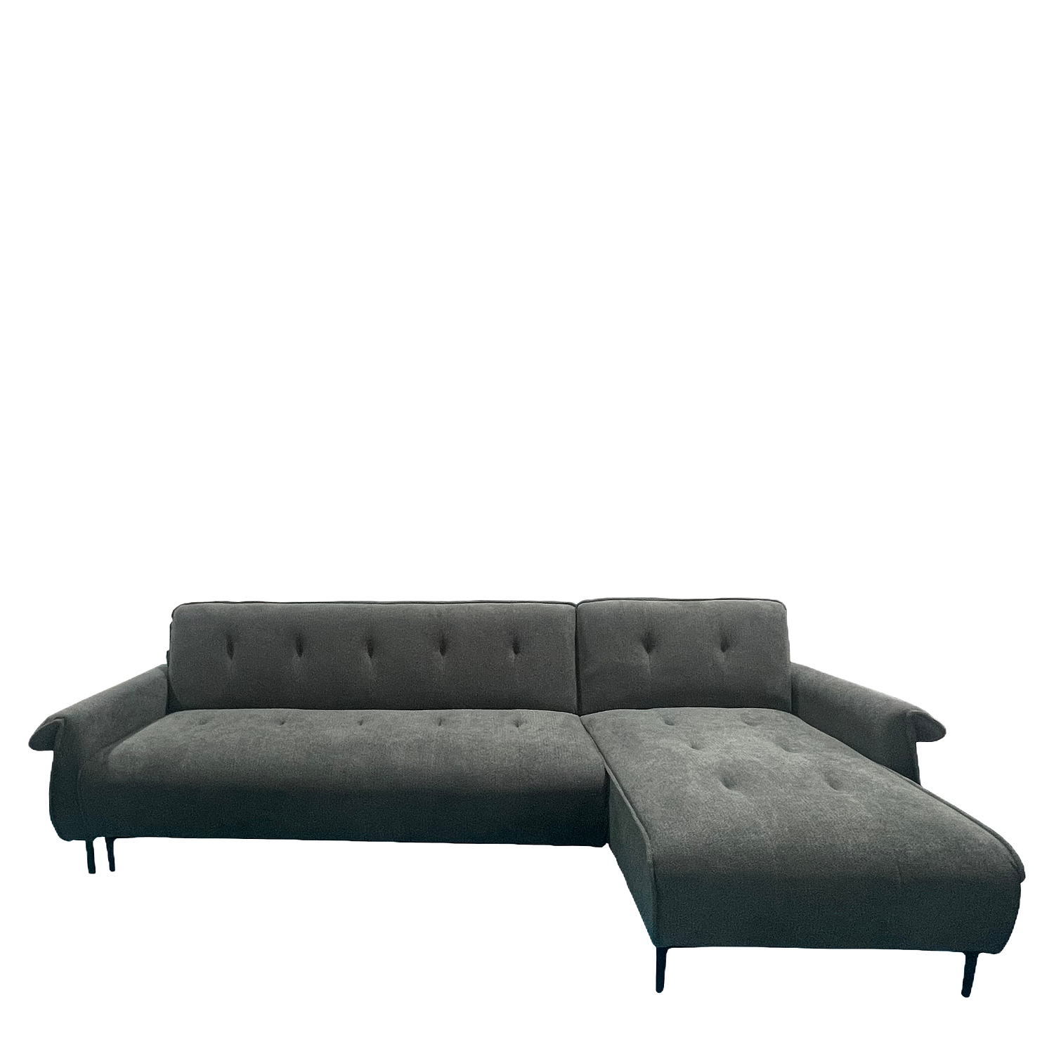 Ο καναπές κρεβάτι γωνιακός αναστρέψιμος ArteLibre SOMERO σε σκούρο γκρι χρώμα παρουσιάζει εκτεταμένη οριζόντια ανάπτυξη και καθαρή γεωμετρική μορφή, με πλευρική σεζλόνγκ που ενσωματώνεται στο συνολικό σώμα. Η ενιαία υφασμάτινη επένδυση και η κουμπωτή διαμόρφωση της επιφάνειας δημιουργούν ομοιόμορφη οπτική παρουσία, ενώ τα ενσωματωμένα μπράτσα και τα μεταλλικά πόδια διαμορφώνουν σαφή αρχιτεκτονική γραμμή. Η δυνατότητα μετατροπής σε κρεβάτι επεκτείνει τη λειτουργική χρήση του σε επαγγελματικούς χώρους φιλοξενίας, suites και lounge περιβάλλοντα.