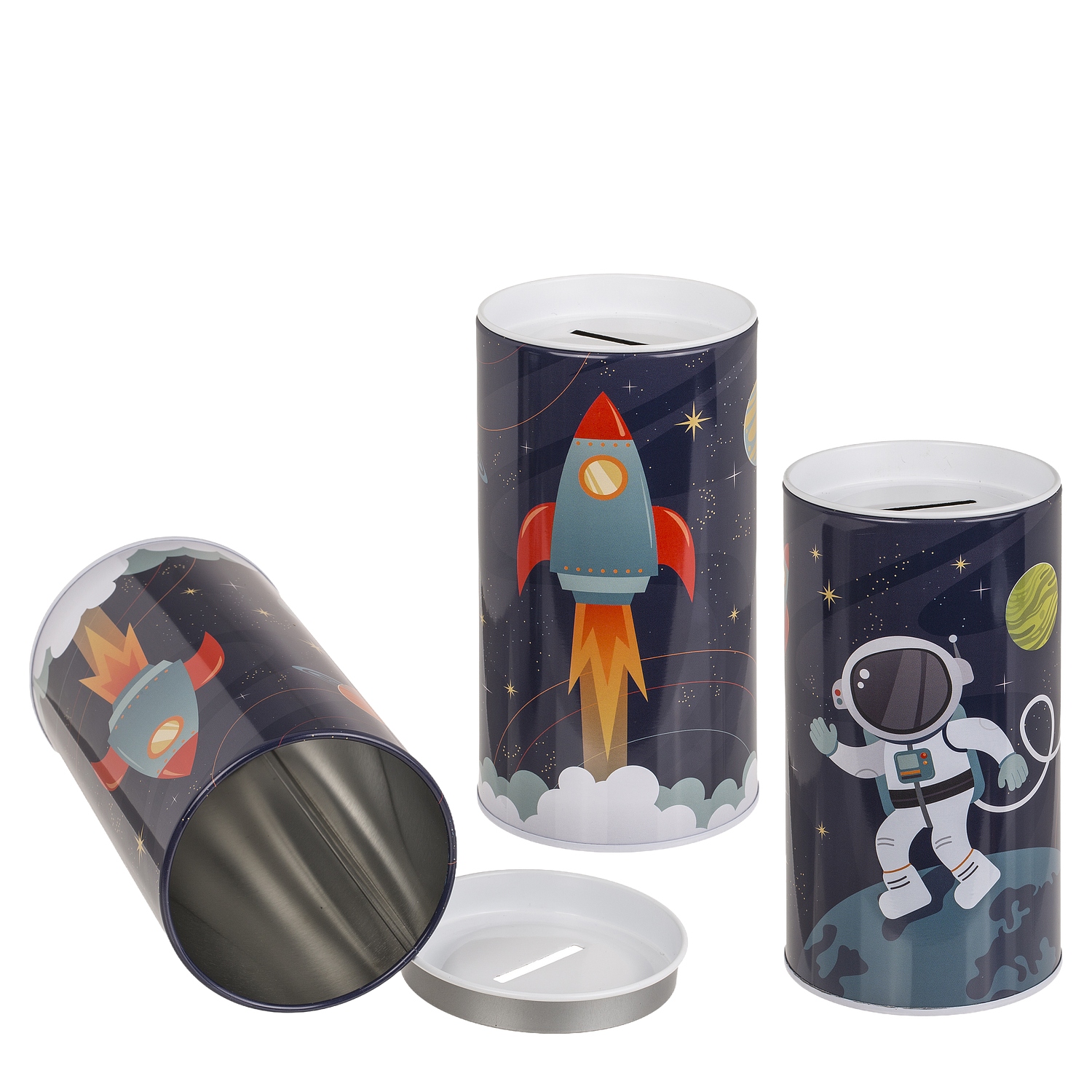 Κουμπαράς διάστημα με αποσπώμενο καπάκι μέταλλο 15.5x8cm σε 2 σχέδια.
