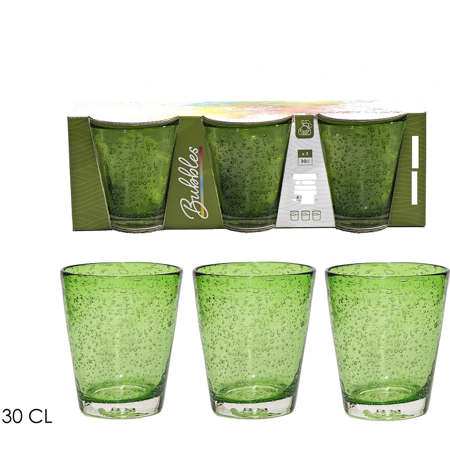 Σετ 3 ποτηριών από πράσινο χειροποίητο φυσητό γυαλί, χωρητικότητας 30 cl το καθένα. Ιδανικά για να απολαύσετε τα αγαπημένα σας ποτά με στυλ.