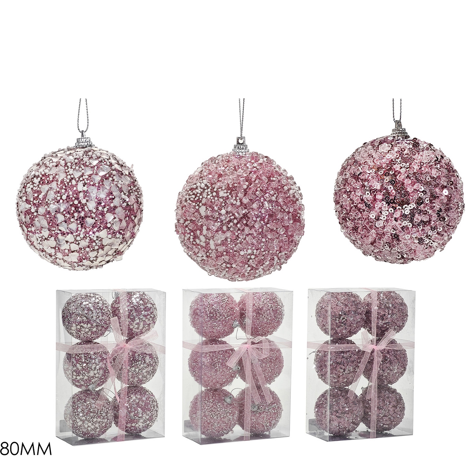 Χριστουγεννιάτικη Μπάλα Ροζ 80mm Σετ 6Τμχ Σε 3 Σχέδια