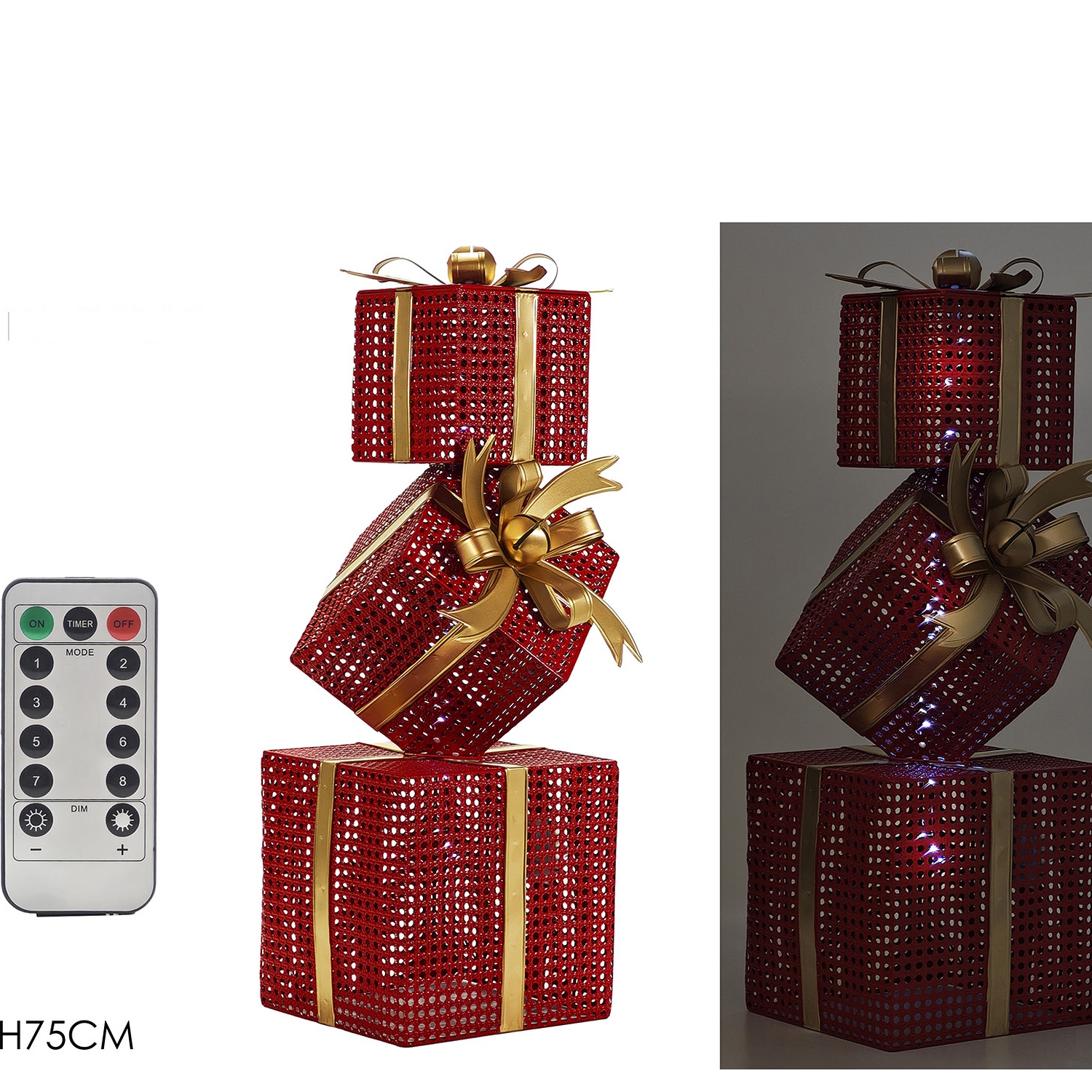 Προσθέστε μια μαγευτική και γιορτινή πινελιά στον χώρο σας με αυτά τα φωτιζόμενα χριστουγεννιάτικα δώρα. Με ύψος 75cm και χρώμα κόκκινο με χρυσό, αυτά τα δώρα είναι ιδανικά για να τοποθετήσετε σε τραπέζια, ράφια ή κονσόλες. Προσφέρουν μια ζεστή και λαμπερή αίσθηση στον χώρο σας, ενώ συνοδεύονται από τηλεχειριστήριο για εύκολη χρήση.
