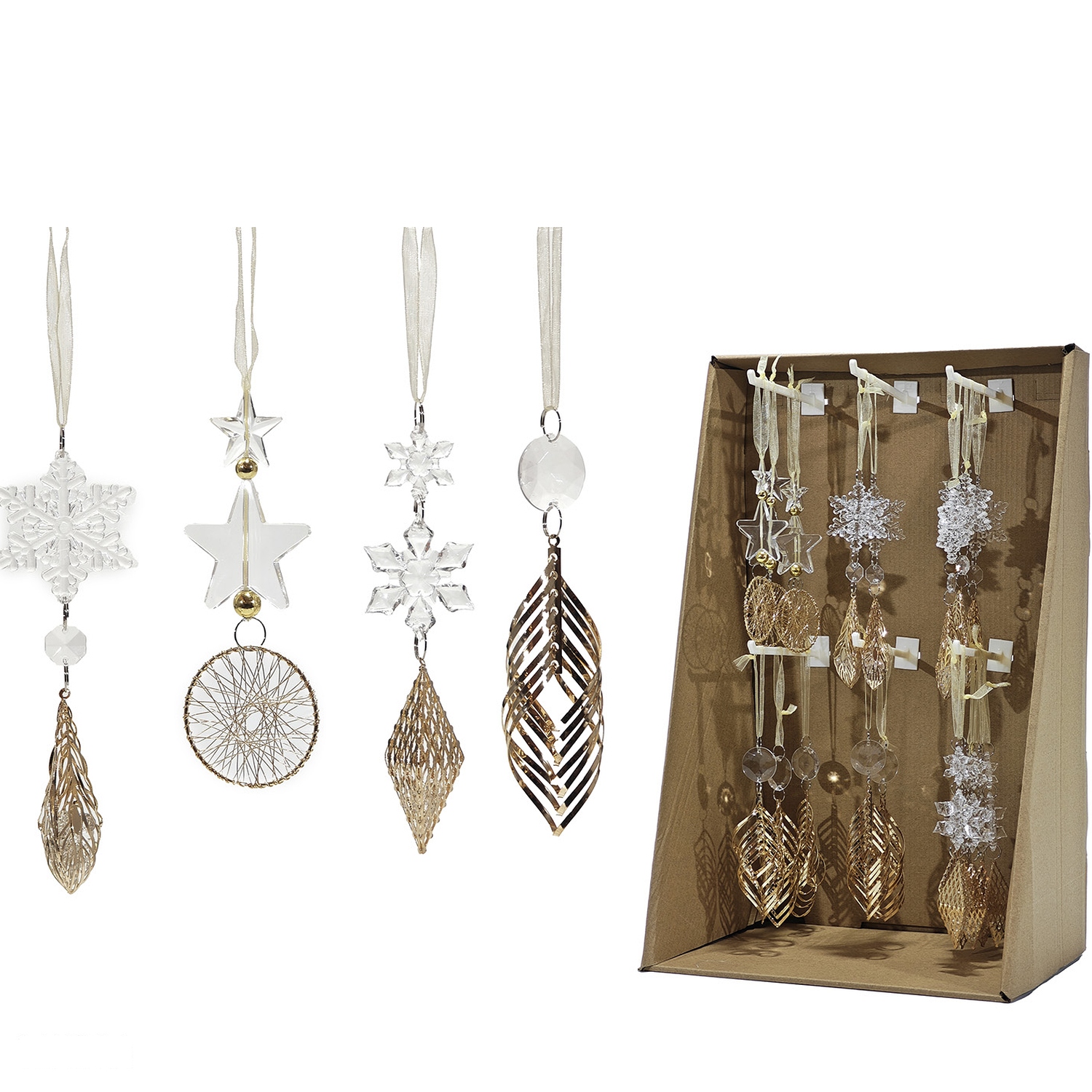 Προσθέστε κομψότητα και λάμψη στη χριστουγεννιάτικη διακόσμησή σας με αυτά τα κρεμαστά διακοσμητικά. Είναι διαθέσιμο σε τέσσερα διαφορετικά σχέδια, το καθένα με μοναδικές λεπτομέρειες και χρώματα που προσφέρουν μια εκλεπτυσμένη εμφάνιση. Ιδανικά για το δέντρο ή άλλες γιορτινές διακοσμήσεις, αυτά τα διακοσμητικά θα δημιουργήσουν μια μαγευτική και ζεστή ατμόσφαιρα στο σπίτι σας.