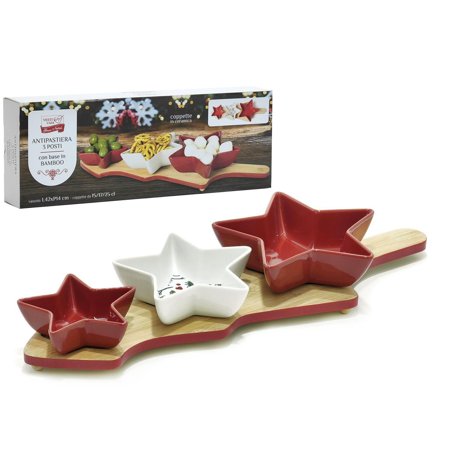Δίσκος σερβιρίσματος ορεκτικών σε σχήμα δέντρο με 3 δοχεία φυσικό/κόκκινο/λευκό κεραμικό/μπαμπού 42x14cm