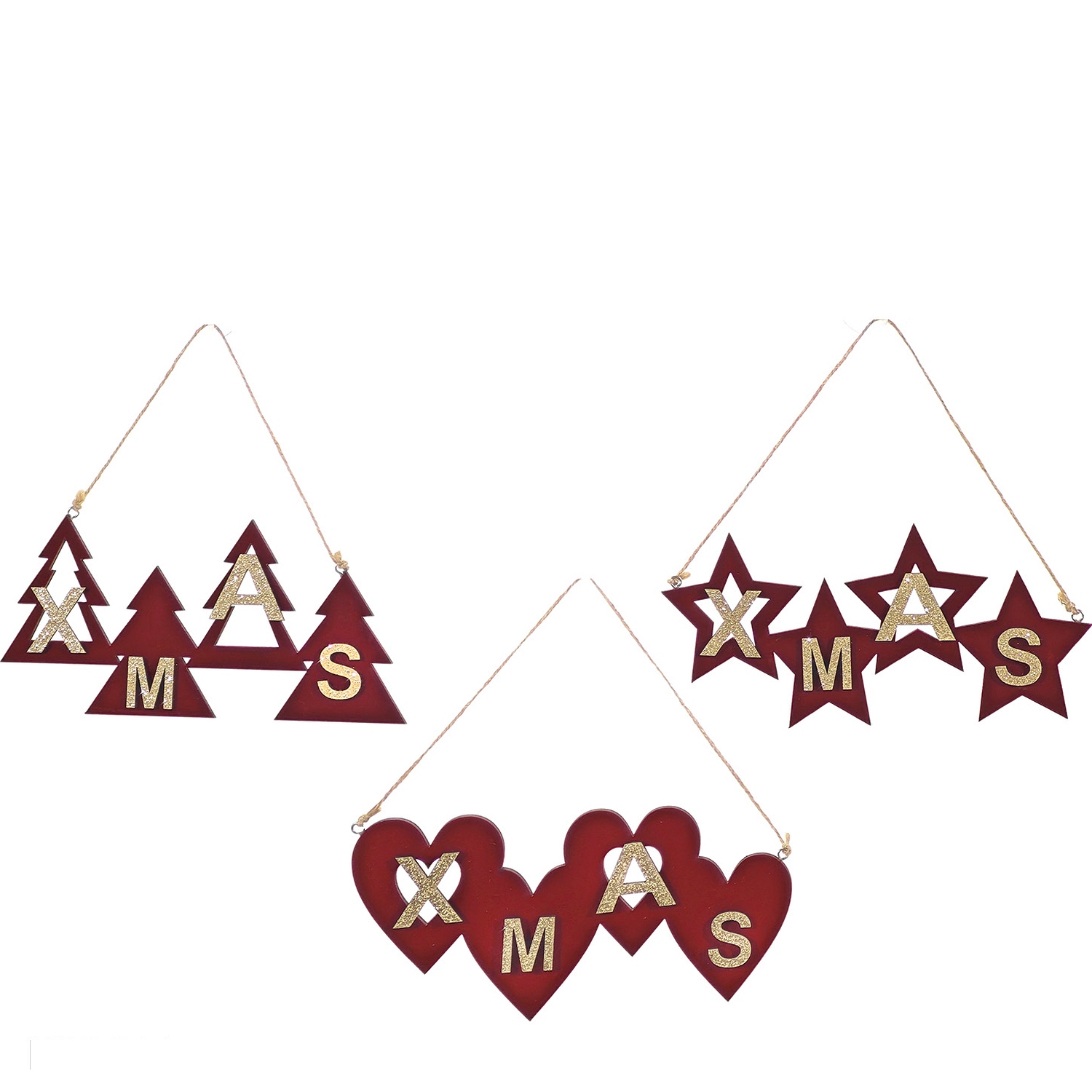 Δημιουργήστε μια γιορτινή ατμόσφαιρα με αυτά τα ξύλινα κρεμαστά διακοσμητικά σε κόκκινο χρώμα. είναι διαθέσιμο σε τρία διαφορετικά σχέδια με το μήνυμα 'XMAS', προσφέροντας μια παραδοσιακή και ζεστή πινελιά στη διακόσμησή σας. Ιδανικά για το δέντρο ή οποιοδήποτε άλλο μέρος στο σπίτι σας.