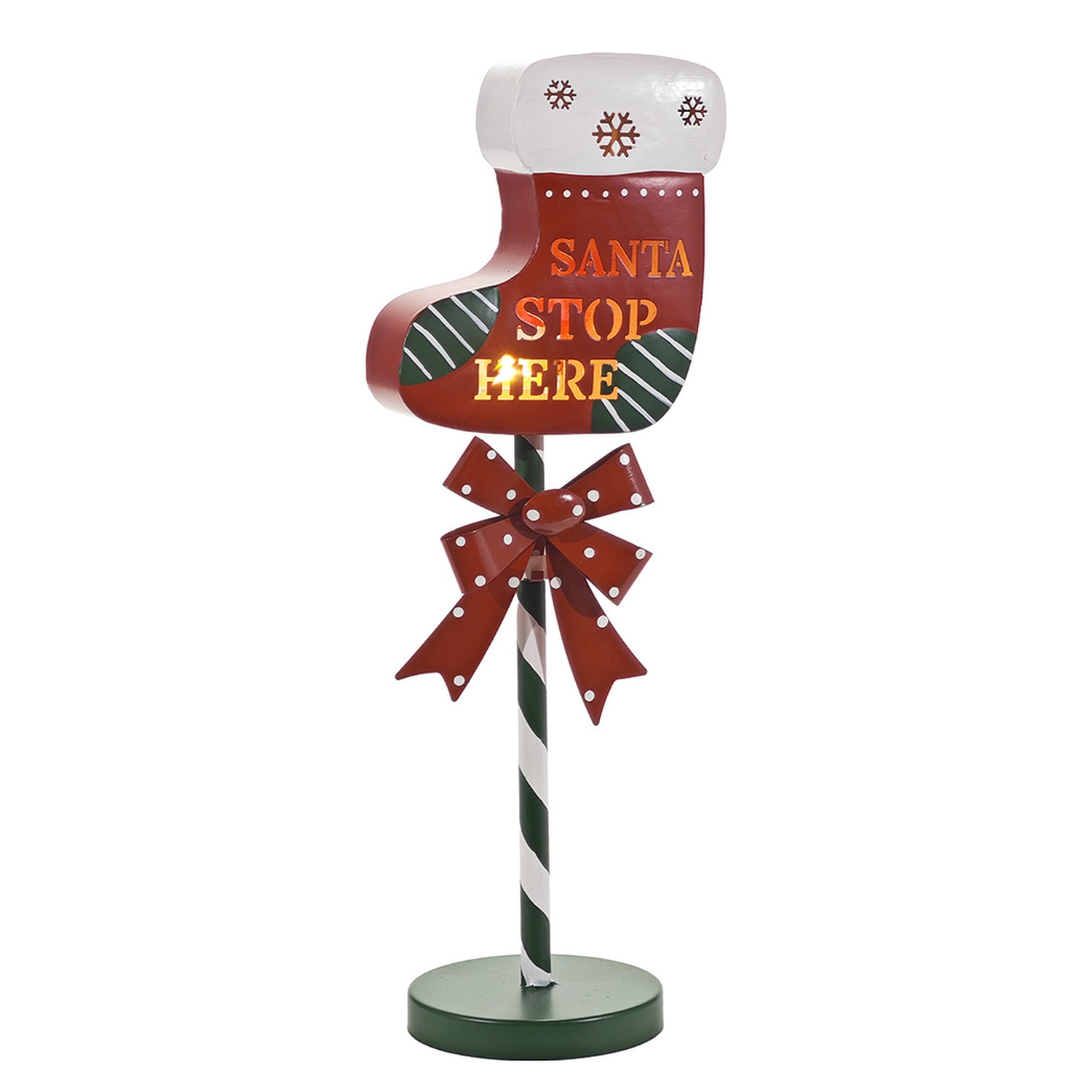 Προσθέστε μια φωτεινή και γιορτινή αίσθηση στο σπίτι σας με αυτή τη χριστουγεννιάτικη διακόσμηση σε σχήμα μπότας. Με ύψος 53cm, αυτή η διακόσμηση διαθέτει φωτισμό LED και το μήνυμα 'Santa Stop Here', προσφέροντας λάμψη και ζεστασιά στη διακόσμησή σας. Ιδανική για να τοποθετηθεί σε ράφια, τραπέζια ή οποιοδήποτε σημείο του σπιτιού σας που χρειάζεται μια γιορτινή πινελιά.