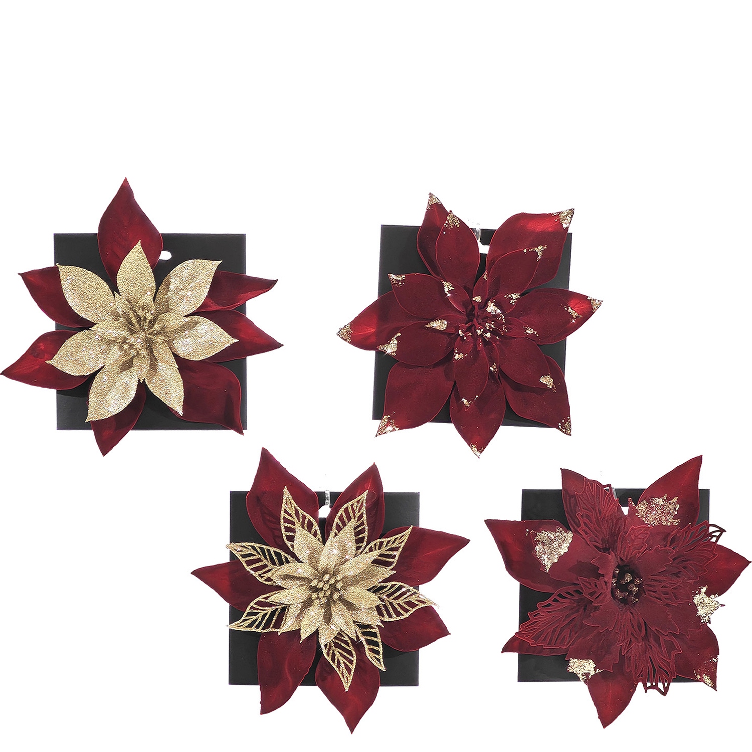 Αναβαθμίστε την χριστουγεννιάτικη διακόσμηση σας με αυτό το κομψό διακοσμητικό λουλούδι σε κόκκινο χρώμα. Διαθέσιμο σε τέσσερα διαφορετικά σχέδια, αυτό το λουλούδι μπορεί να χρησιμοποιηθεί για να προσθέσει μια ξεχωριστή πινελιά στο χριστουγεννιάτικο δέντρο, σε στεφάνια ή σε οποιαδήποτε άλλη διακόσμηση. Το διαχρονικό του σχέδιο και η υψηλή ποιότητα κατασκευής του θα σας ενθουσιάσουν.