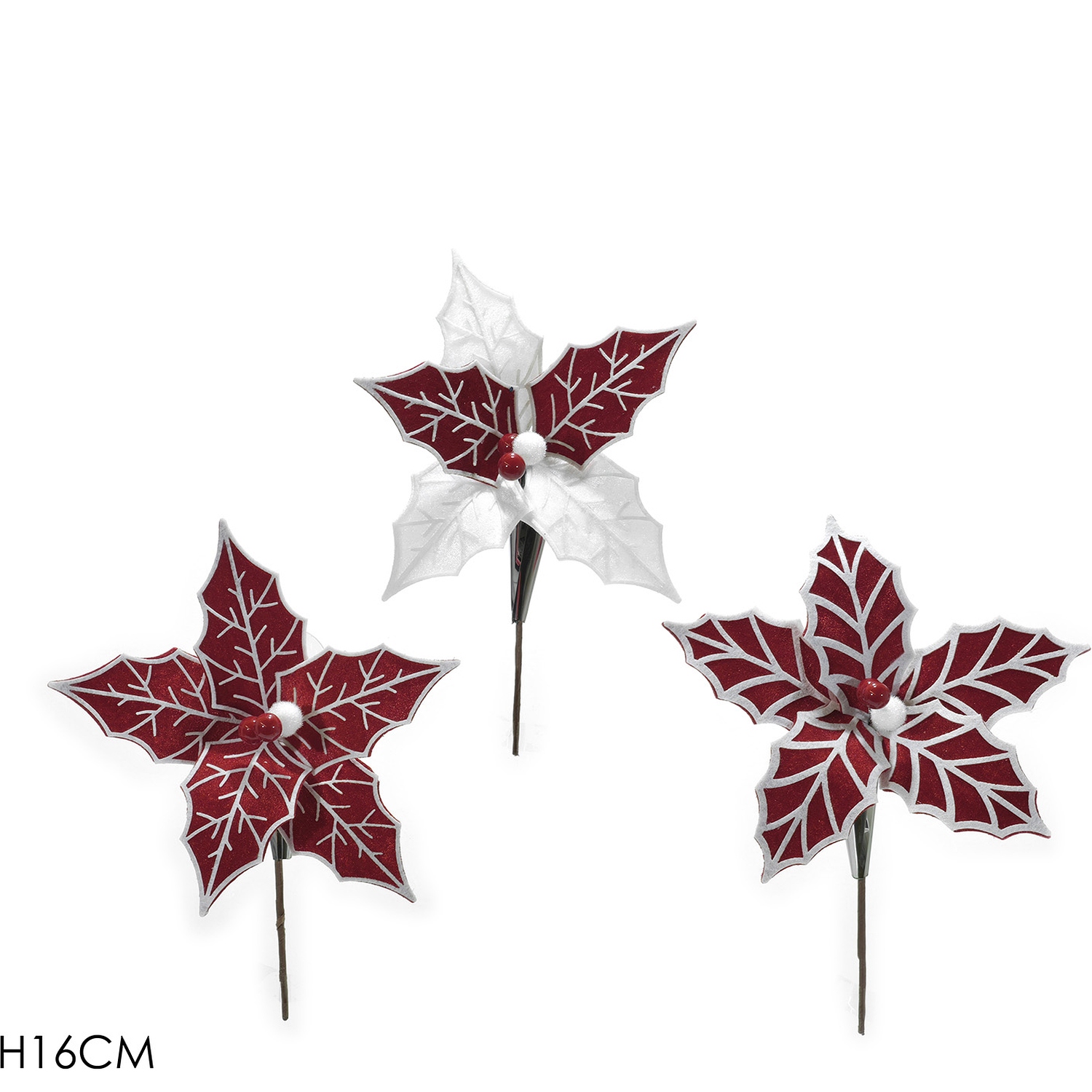 Χριστουγεννιάτικο Κλαδί Με Λουλούδι Κόκκινο/Λευκό 16cm Σε 3 Σχέδια