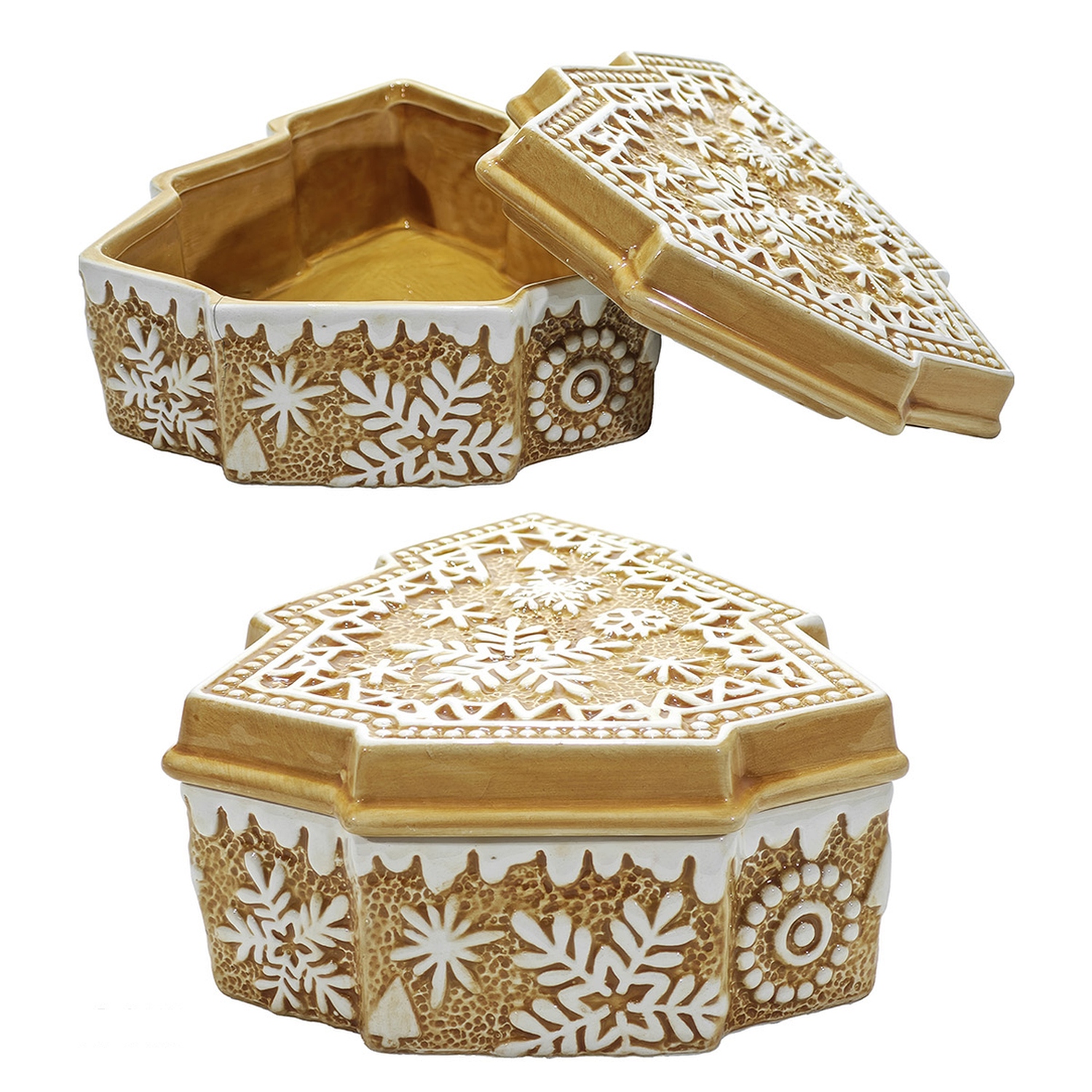 Προσθέστε μια γλυκιά και γιορτινή αίσθηση στο σπίτι σας με αυτό το χριστουγεννιάτικο κουτί σε σχήμα δέντρου. Με διαστάσεις 19x21cm, αυτό το κουτί είναι διακοσμημένο με μοτίβα gingerbread, προσφέροντας ζωντάνια και μαγεία στη διακόσμησή σας. Ιδανικό για να αποθηκεύσετε μικρά αντικείμενα ή να το χρησιμοποιήσετε ως διακοσμητικό στοιχείο κατά τη διάρκεια των γιορτών.