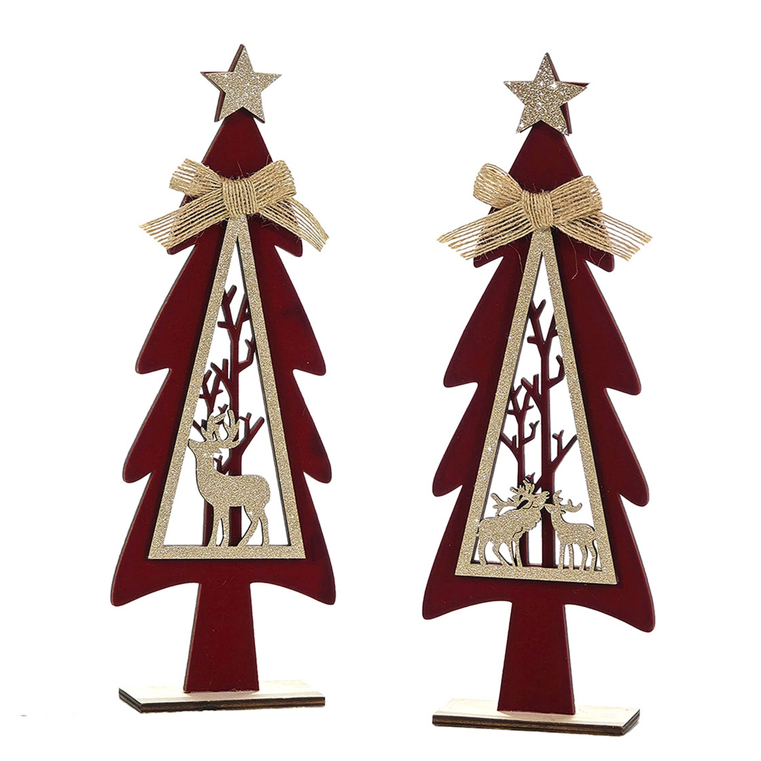 Προσθέστε μια κομψή και εορταστική πινελιά στο χώρο σας με αυτό το ξύλινο διακοσμητικό δέντρο σε κόκκινο χρώμα. Είναι διαθέσιμο σε δύο διαφορετικά σχέδια, το καθένα με λεπτομέρειες από χρυσό και φιόγκους που προσδίδουν μια εκλεπτυσμένη εμφάνιση. Ιδανικό για το χριστουγεννιάτικο δέντρο ή οποιοδήποτε άλλο σημείο στο σπίτι σας, αυτό το διακοσμητικό θα προσφέρει μια ζεστή και γιορτινή ατμόσφαιρα.